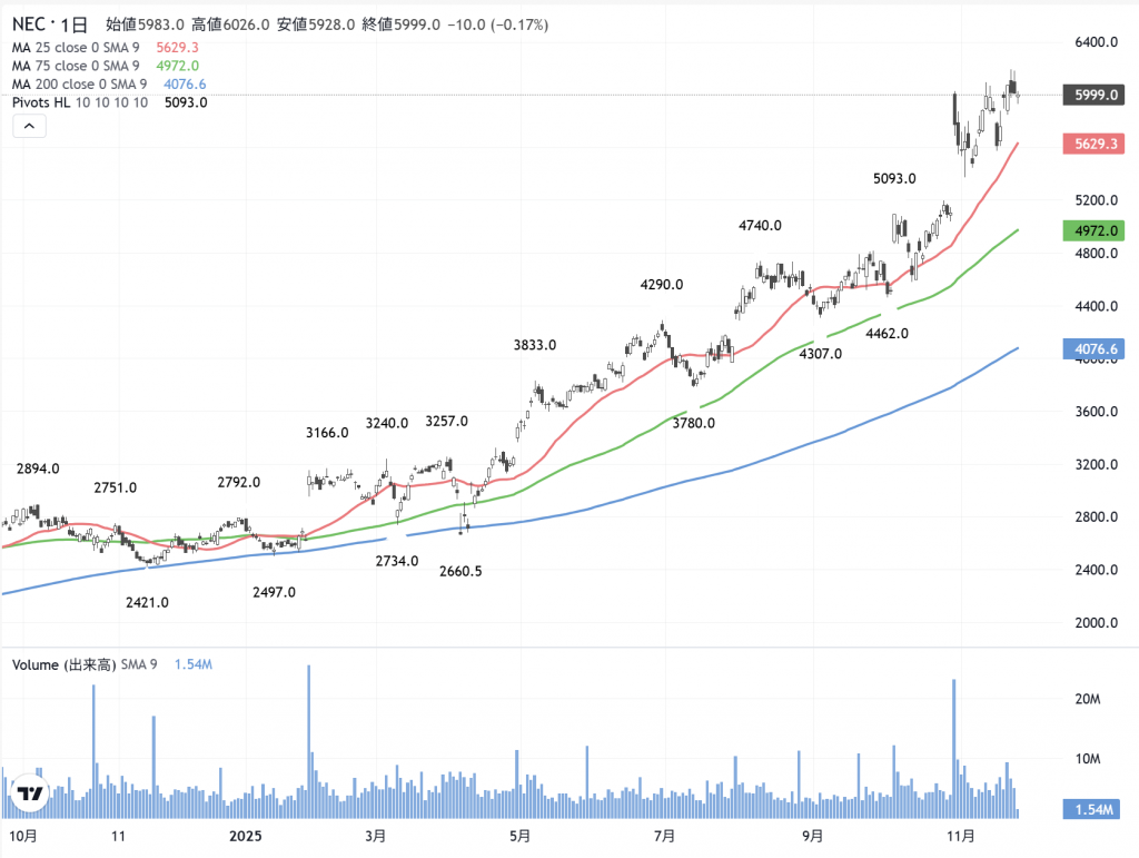 今が「名目時代」だと言う事は…至る所で散見されます。「日立」(6501)や「重工」(7011)だけでなく、顔認証世界一の「NEC」(6701)も、同じです。当たる確率は、高いから意外に年末に向け…、昔の相場のように、株価は「上がり始める」かもしれません。