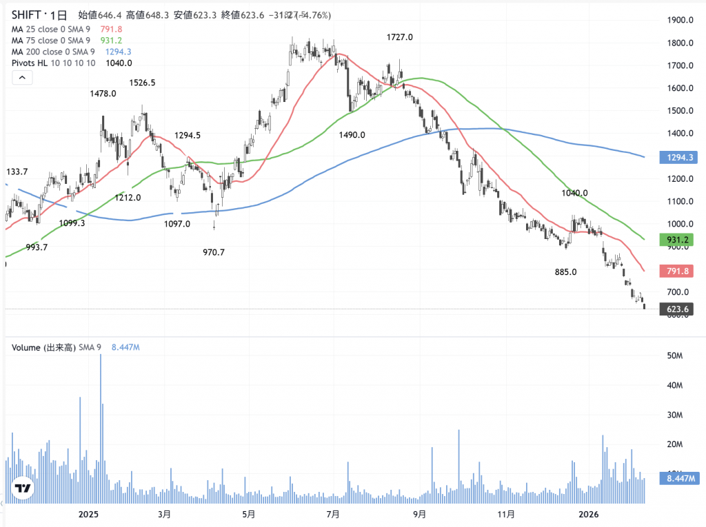 「市場の整合性」から、一連のソフト産業株、つまり昨年調べたDX株の株価評価が、かなり劣化して…伝えられています。メディアは「SaaSの死」と大々的な報道で、連日、株価は値下がりして…10%近い下落をすることもあるのです。SHIFTの200日線のマイナス乖離は、実に51.8%なのです。計算は間違ってないですよね。株価が623.6円で200日線は1294.3円ですから…そうですネ。マイナス51%なのです。