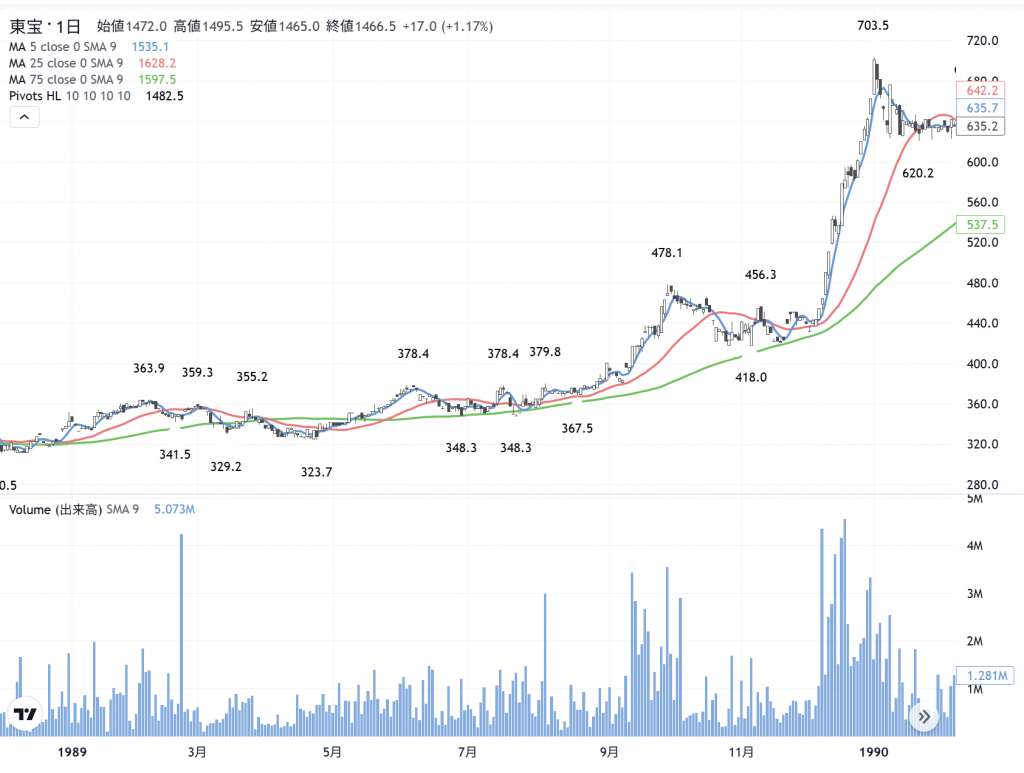 この視点では「IP銘柄」の選択も、その可能性が高い…視点です。カタルは「東宝」(9602)の相場が「忘れること」が出来ません。1989年に上京した当時…既に、後講釈になるのですが、日本はバブルの清算に移動していたのでしょう。最後は、日経指数銘柄だけの乱舞でした。