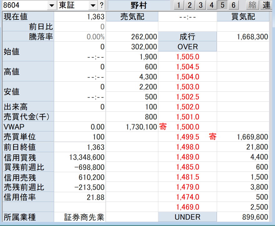 何故か…自社株買いを終了した野村証券(8604)の寄り付き前の気配値は1500円を超えてきました。通常、自社株買いが終了すると、株価は下がるものですが…この気配値は本当なのでしょうか? あと1分です。