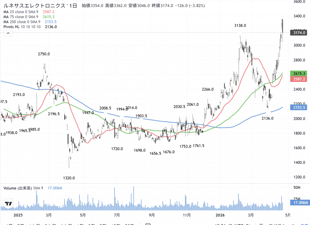 やはり「逃がした魚」は大きかった…可能性が在ります。当面は今、持っている少ない株は売らずに、何処かで…逆に「買い増し」の可能性を考えましょう。ルネサスエレク(6723)の話です。