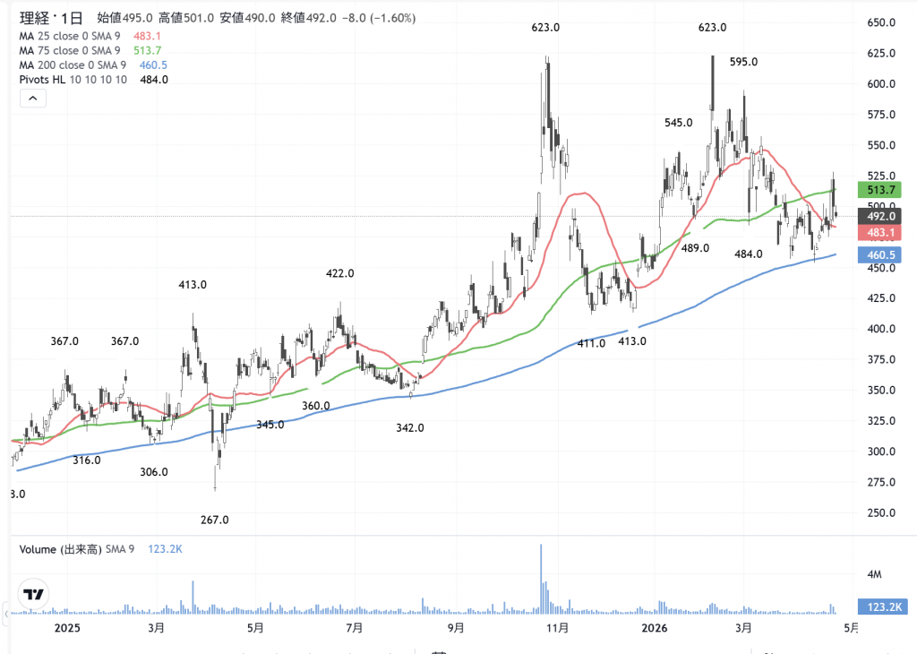 逆に…今日初めて打診買いをした…これは防衛関連かな? 理経(8226)の…昨日の動きに変化を感じましたから、今日の株価が下がって来ましたから、今ほど503円で500株ずつ…合計1000株、更に500円でも買い物を用いました。数字が合う…珍しい過去のTICK回数から観た「人気株」です。
