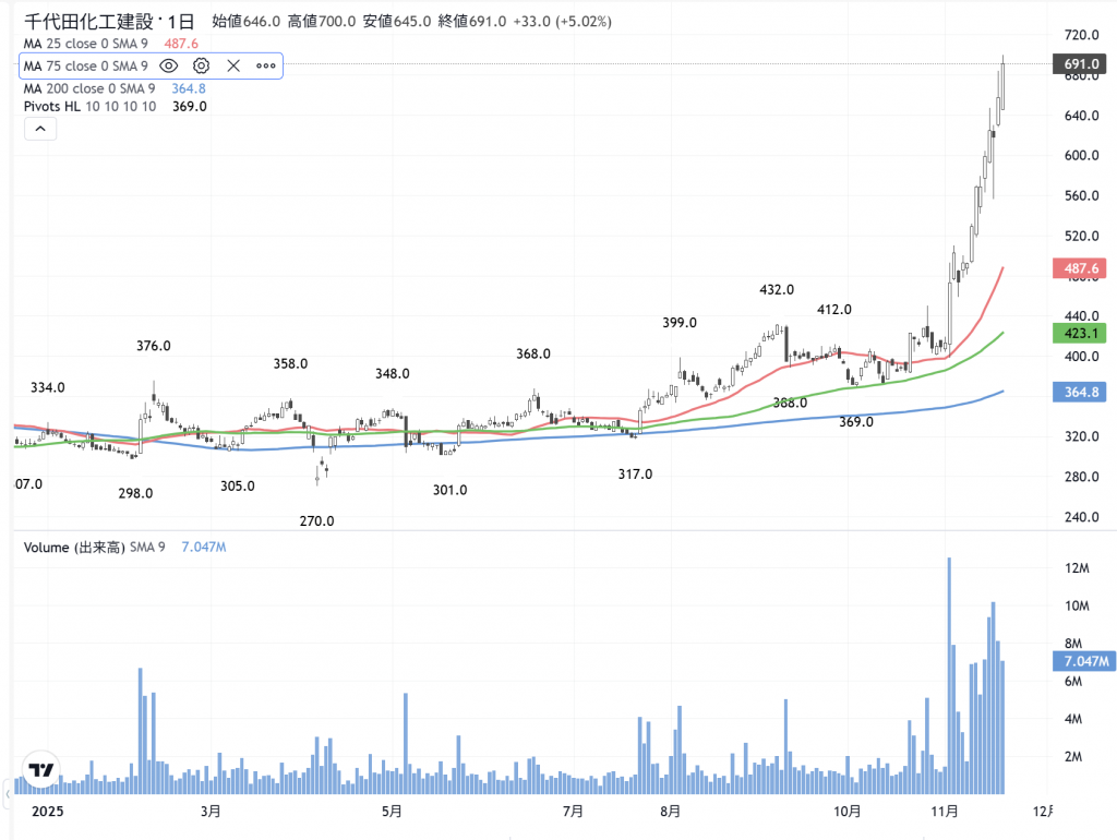 それでも今の「出来高推移」を観ると、簡単に「株価が変動するかも」しれません。だから「成行き」の注文は、絶対に…「厳禁」です。参加も最低で「100株」、多くても…4回の「400株」です。しかも参加に辺り…上限の株価は「1515円」です。この株価は11月17日に付けたものです。