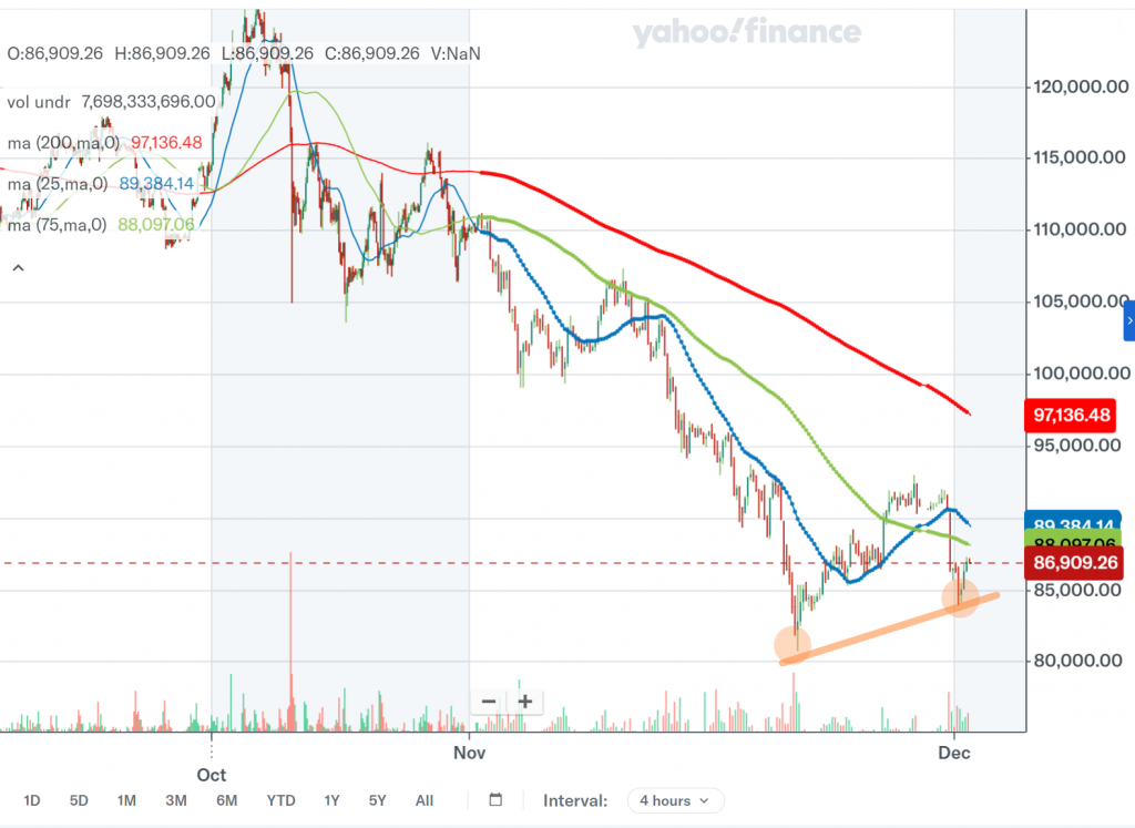 ビットコイン の4時間足の推移(右肩上がり=底入れ?)