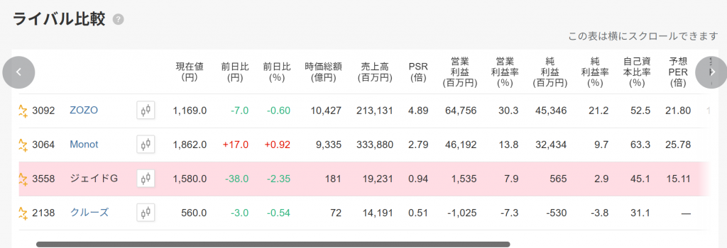 僕が「比較している」訳ではありませんよ。一般的な認識の「東洋経済新報社」が比較しているのです。この比較を観て「おかしな株価評価だ」と思わない人は、自分で考えない人です。そのMonotaRO(3064)のPSRは2.79倍なのです。