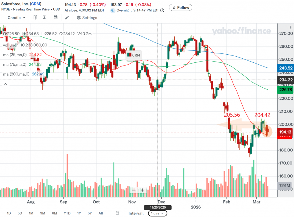 新聞記事の読み方もチャートの見方も、皆さんは、出来ないようです。上のセールフォース(CRM)は日足です。「陰の陰」の日足です。