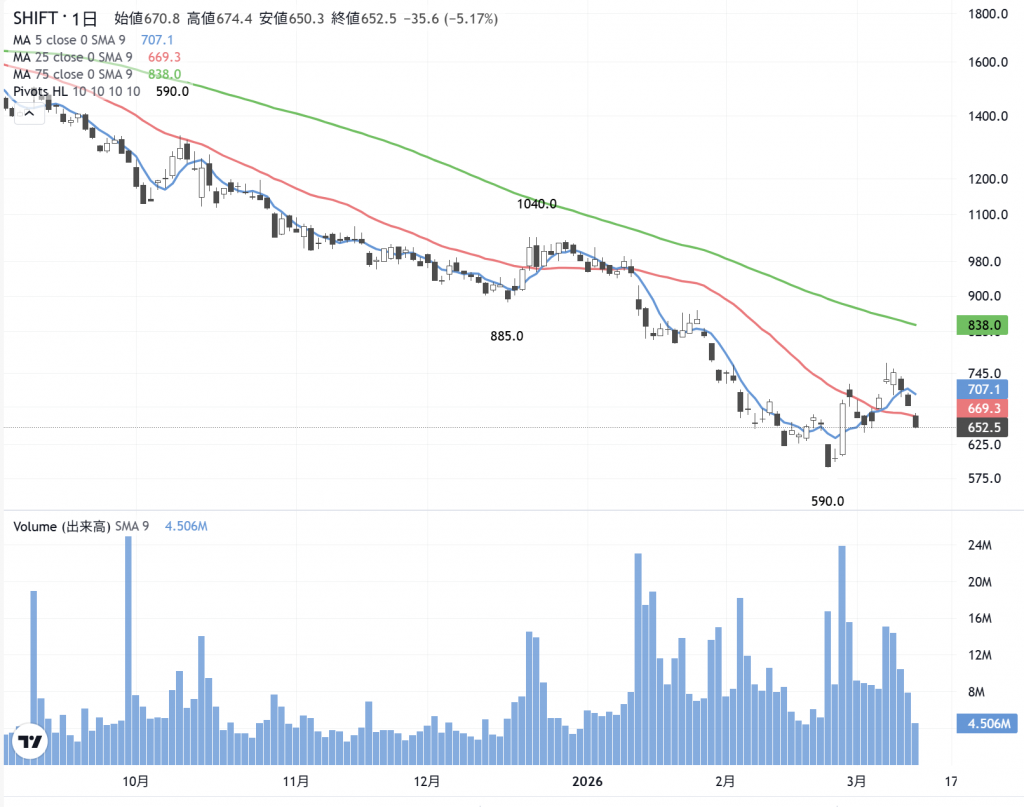 セールスフォースは「外部資金」も利用するようです。それだけ…世間は「SaaSの死」を述べていますが、経営者は、未来に自信を持っているのでしょう。故に、カタルもソフト産業の株価は「買いだろう」と思っており、実際にSHIFT(3697)に狙いを定めて…株を買っています。ただ…昨日の寄り付きで少し外したのです。でも下がって来ると…買いたくなる性格です。困ったものですよ。本当に…。また追加で650円に買い物を用いました。
