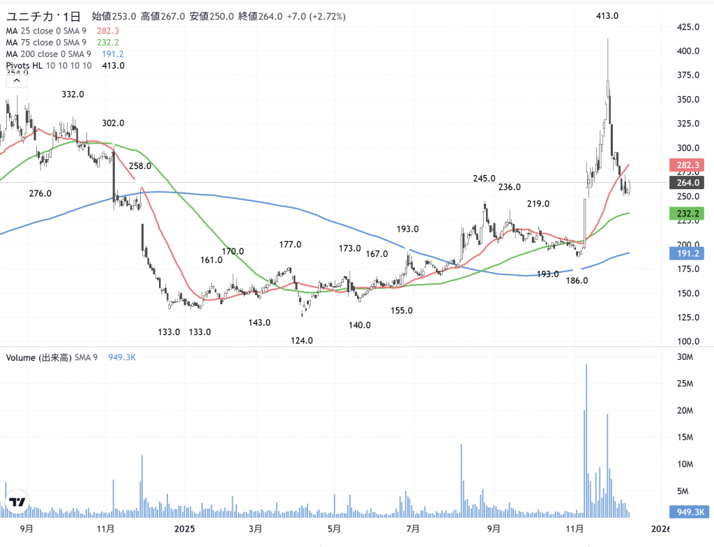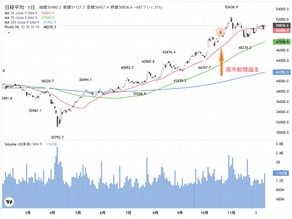 高市総理は10月21日に誕生しました。彼女の任期中に、どれだけ株価が上がるのか? 楽しみですね。あと一週間ほどで、目先の乖離調整は「ひと段落」を迎えるのでしょう。この理由は75日線が毎日100円ほど上がっており、52636円の高値を付けた後の安値は48235円です。この水準に75日線が引き上がるまで時間軸は、目先の軽い…調整波動なのでしょう。安倍政権は、名目経済への「基礎」(土台)を創ったように思っています。その土台を利用して、ようやく…次なる時代への「ステップ・アップ」です。外部環境は準備万端です。