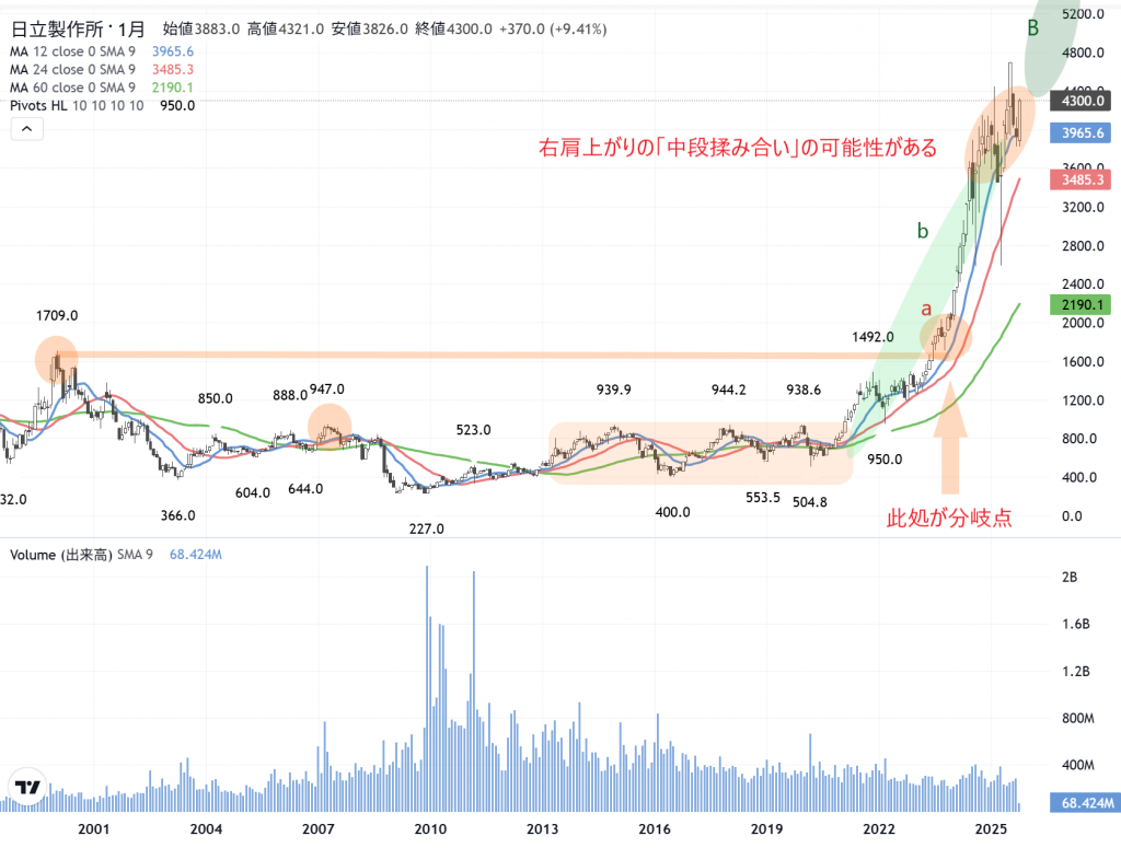 今までは「変わらないことが、日立の社風」と述べた社長室長の言葉が変化した「変貌」を市場は大きく評価しました。だから、リーマン前の947円の壁を抜いて、ITバブル時代の1709円の高値を抜いたのです。チャート上では「a」の場面です。