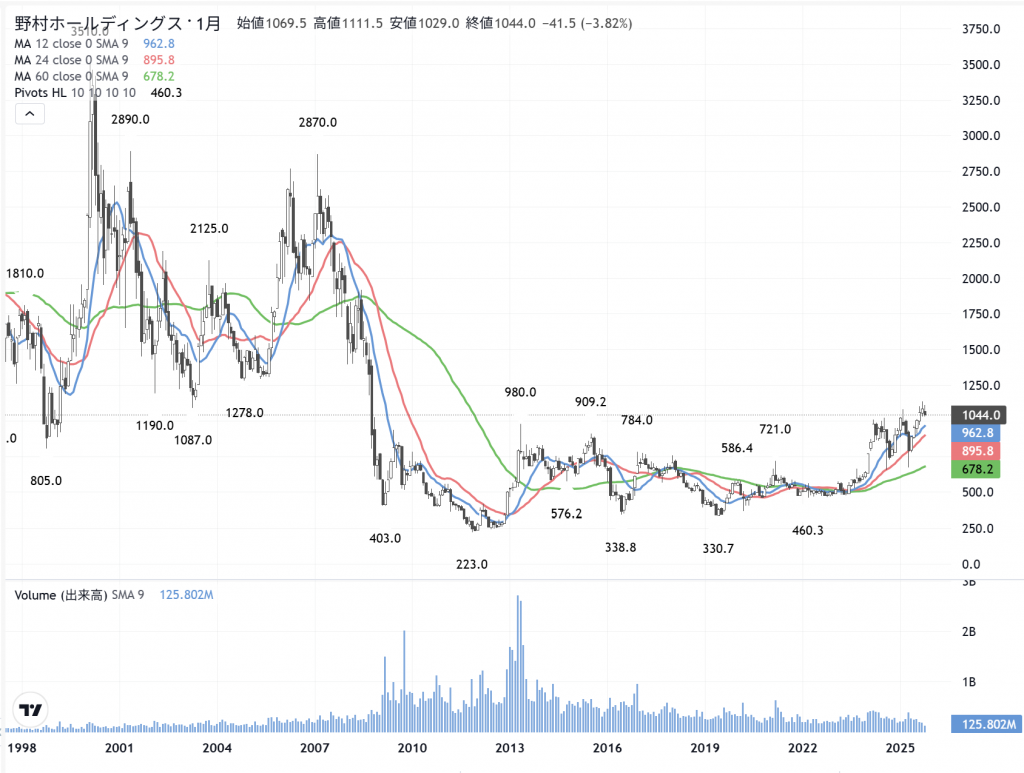 しかし…その「野村証券」は223円から980円に行きましたが、そこ止まりで…その動きは終わり「横ばい波動」が続いています。最近、ようやく2013年の高値980円を奪回した所です。