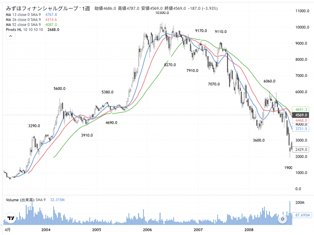 リーマン前の2003年は「みずほが倒産するなら、日本は沈没だ!」のキャッチフレーズで、全顧客に「みずほ」の株を買わせ続け…10万円の株が58300円だったかな? 当時の株価10万円は、今の株価で100円です。だから100円の株が58円になったのです。