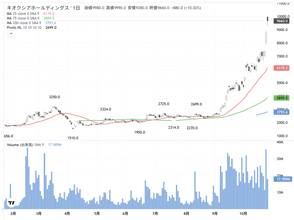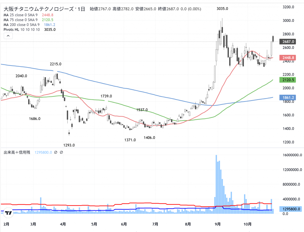 「日証金」で、大阪チタンの「売り残」が10万株増えたのです。カタルは皆さんに、ちゃんと事前告知をして「伝えています」からね。10月20日だから…10月21日の原稿かな?(キオクシアのチャートの上の部分ですね。) 20日は2415円の引け値で21日は2473円です。重要な転機になったのです。