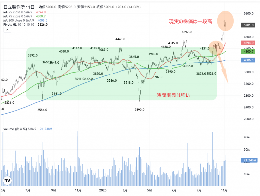 「日立」は高値圏で、1年以上…正確には、1年と3ケ月かな? そのような時間を掛けて調整を入れました。基本的に大型株の場合は、「株を持っている人」も多いですから、乖離が開くと…下値で株を買った人が「利食い」をする時間が必要です。人間は、なかなか諦めません。しかし時間には…勝てないものです。