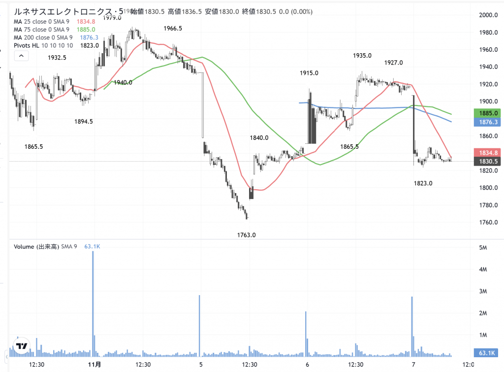 今日は昨日、利食いをした「ルネサスエレク」(6723)を1810円と1800円で500株ずつ買いに行っていますが、まだ買えません。今までの安値は1823円です。別に急ぎません。たぶん、今の下値は1760円程度なのでしょう。