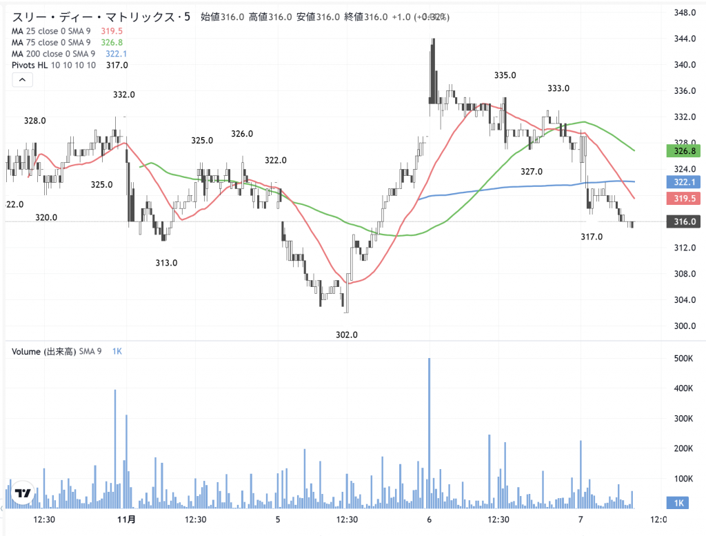 まぁ、このような感覚は「いい加減」なもので、なかなか…当たりません。今日は昨日、利食いした「3Dマトリックス」(7777)も、310円から下値に買い物を入れました。あの日、魔坂、302円まであるとは思ってなかったのです。だから、次の下値はこのラインの305円前後かな?…と「漠然」と考えています。
