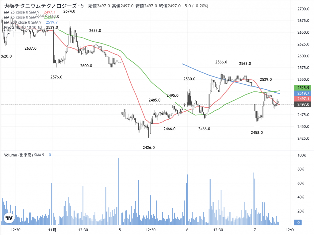 同じことですが、「大阪チタン」(5726)の2460円の300株は買えましたが…下値の2450円からの「買い指値」は買えません。同じように…毎日売買をして「遊んでいる」…相場感覚の話です。基本は、全体株が「安い時」に、株価が高い株は手が入っていると考えても良いのでしょう。