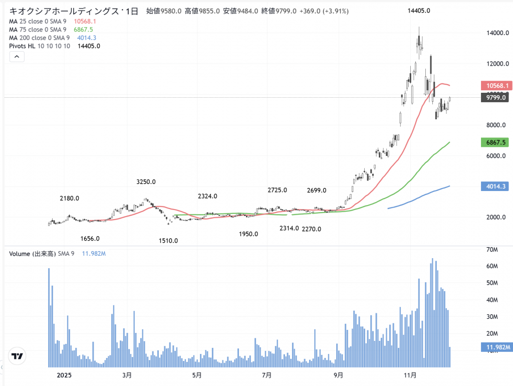 半導体相場が強い「キオクシア」は高いのですね。あの時は「やり過ぎ」感を抱いていましたが、今は「通常の感覚」になって来ました。高値が14405円まであるのです。ビックリポンです。やはり9000円なら買う種族も大勢いるのでしょう。