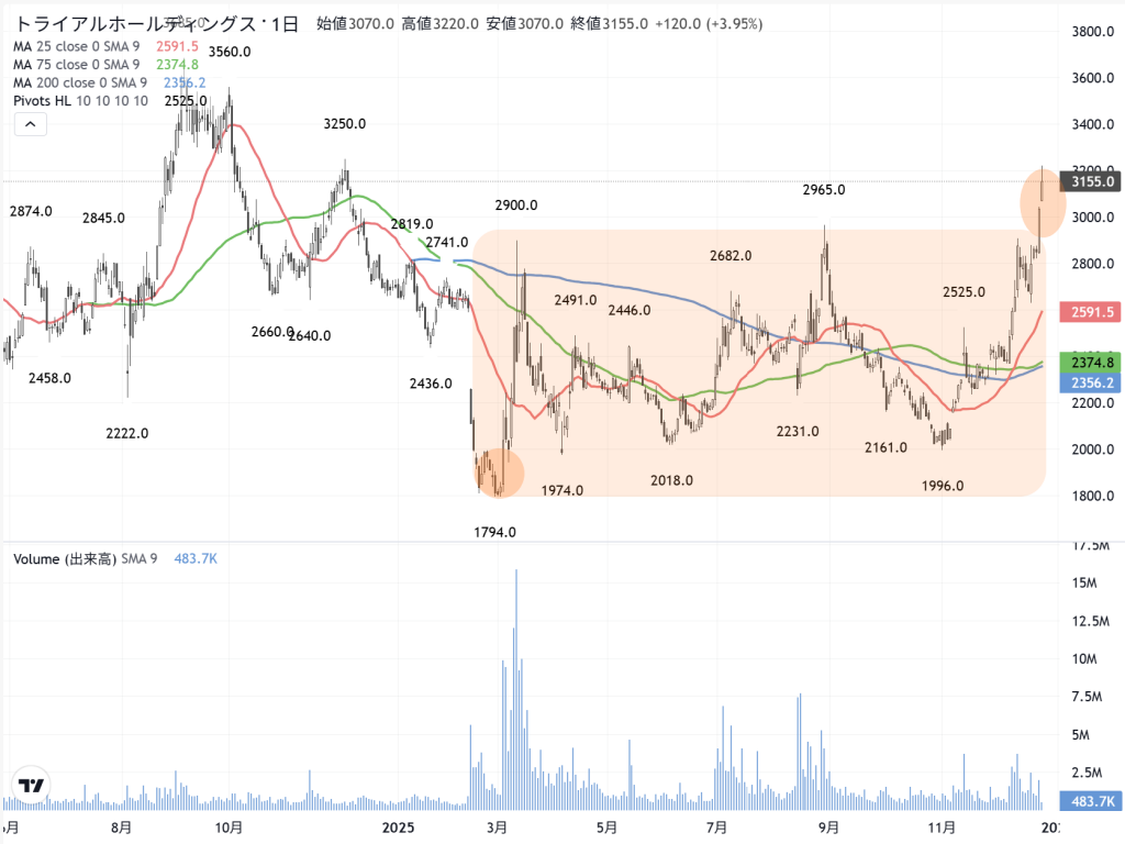 「板硝子」(5202)のような…借金過多の危ない銘柄が買われ、今日は、同じ…借金経営の「トライアル」(141A)を紹介しておきましょう。実は、この銘柄も「カタル銘柄」です。