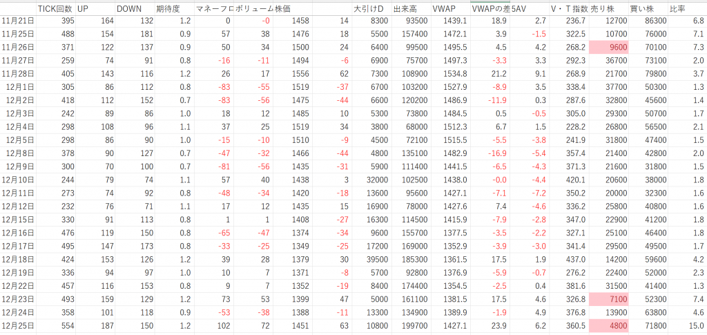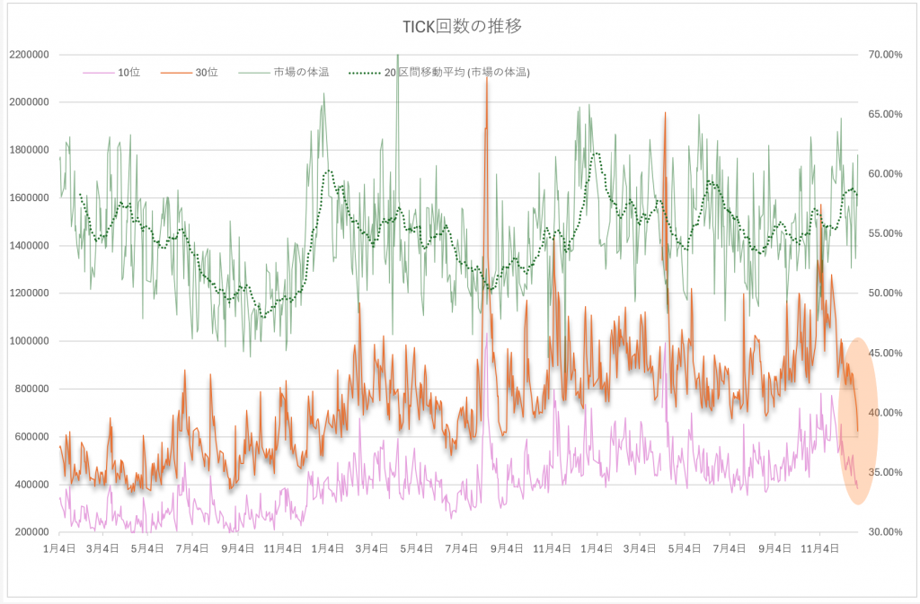 クリスマス休暇で出来高が大きく減って、今の日本の実態が分かります。12月に入り…減り続けるTICK回数です。
