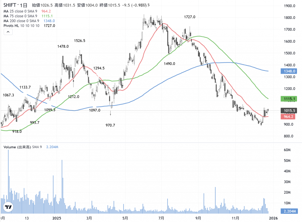 これも原稿に書く以上、少し買ってみますか…。カタルは970円で買い指値を入れてあるのですが…今の相場は、1017円ですね。今日は1026円~1031円まで在って…下値は1004円ですね。ハイ、今1017円で500株だけですが、「SHIFT」(3697)の株を買ってみました。