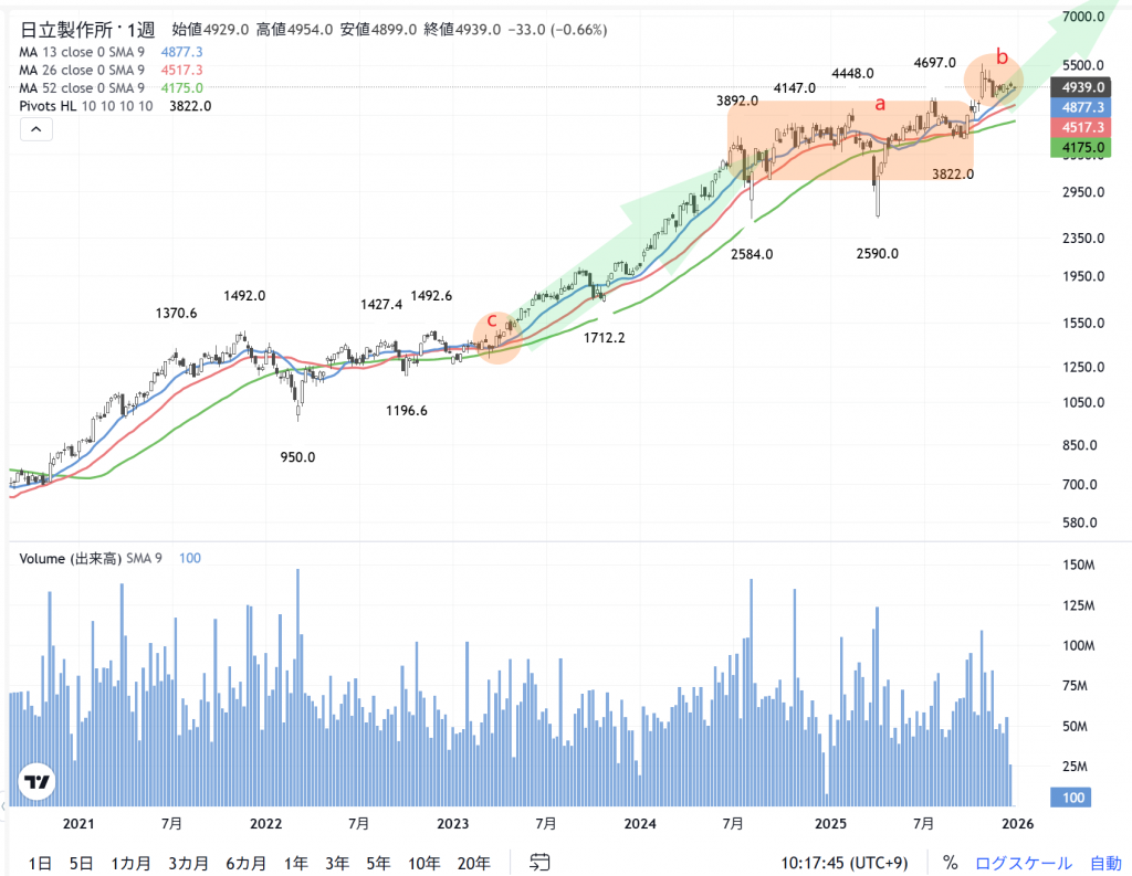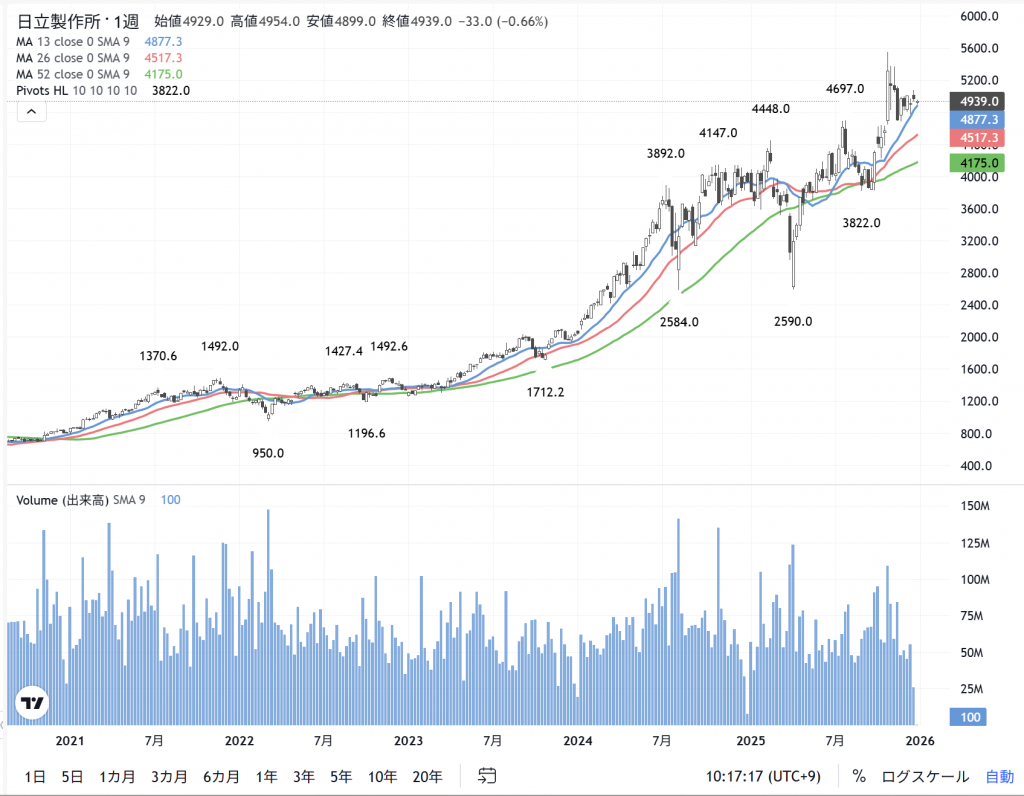 対数チャートの「 日立」(6501)の週足