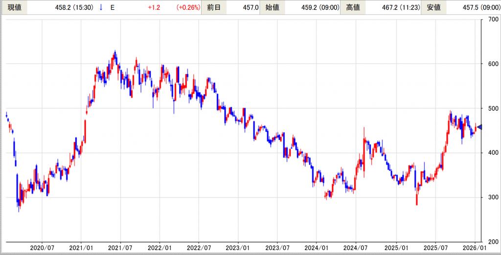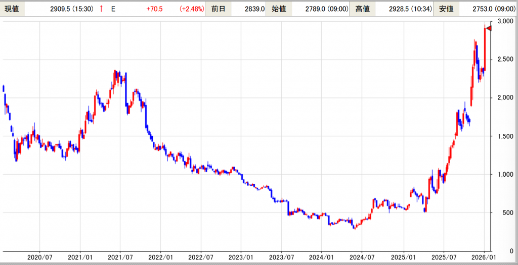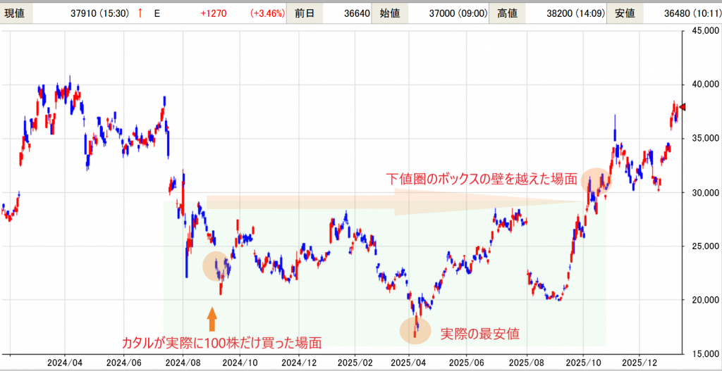 如何ですか? たぶん…2024年8月から9月の場面でしょう。そこから株価はボックス圏に入り、実際の安値は2025年4月から5月でしょうが、まだ本格的な株価上昇にならず、2025年の10月からの上昇場面が、正しい「買い参加」の時間軸なのでしょう。