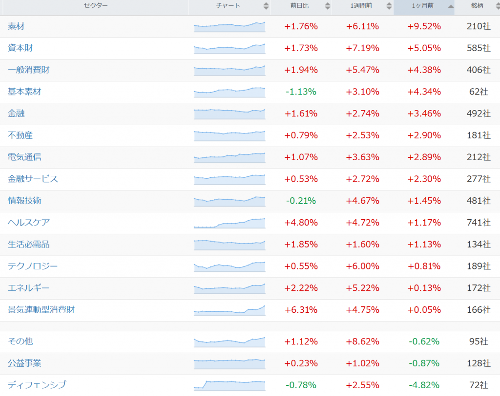 此方のサイトはなかなか優れており業種別の変化が分かり、尚且つその業種のメイン銘柄の動向まで分かりますね。上記のデータは1か月基準のものを掲げてあります。例えば…この物色動向は「素材株」が上がり、「資本財」もなかなか元気な動きです。