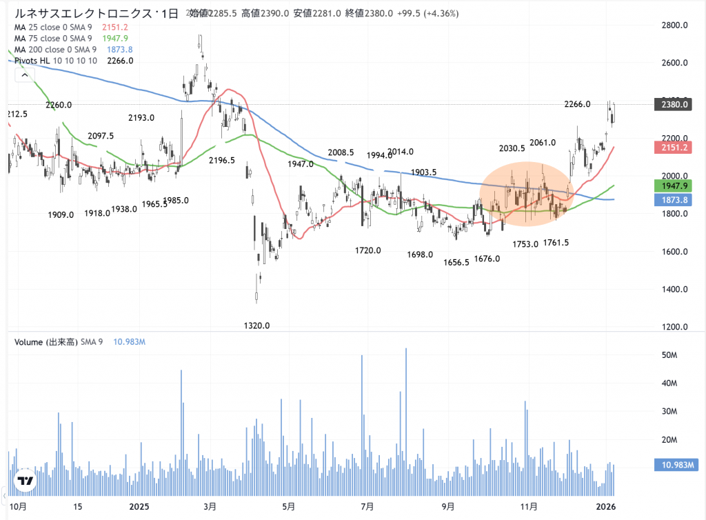 しかし…全体相場が高市効果により、市場要因は大きく改善しています。清貧思想が蔓延する実質経済から、最近は未来の「夢や希望」を語る…相場に変化してきましたね。