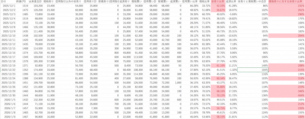 最近の株価動向を観ると「痺れ」が切れて来た「空売り筋」も居るようで、その一部は、買い戻しでしょう。逆に「ここぞ」…とばかり、金曜日のように相場が緩むと…無理をして株価を叩いているようです。実際の空売りの関与率は、連日50%を超えているのです。出来高の半分以上が「空売り」ですよ。異常ですね。