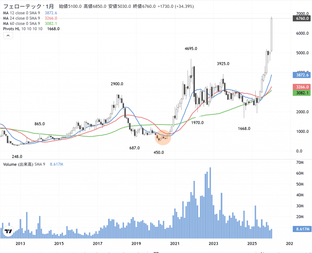 その時間軸を変えたチャートが、上の月足です。本当に、世の中は何が起こるか分かりません。10年程度も経過しておらず、僅か6年で、株価は約10倍です。