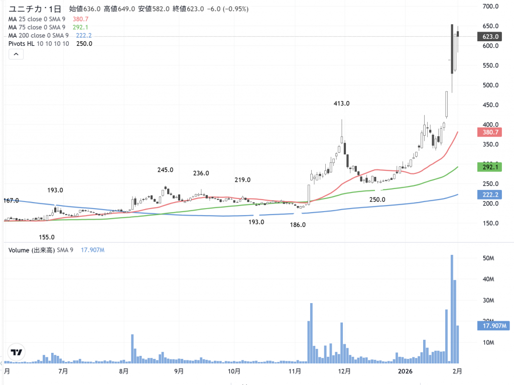 今は、世界舞台で、最先端を行く「ソフトバンクG」(9984)の孫さんは、たった1億円の融資からスタートしました。最初は「本屋さん」ですよ。最後は「経営者の資質」が、ものを言います。それでは、宿題の「サイバーダイン」(7779)からの発展ですが、最近の傾向は、先日の「千代化」もそうですが…「ユニチカ」のチャートも同じです。チャートの質問も在りますから、少し解説をしましょう。