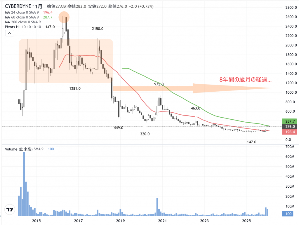 この説明も、必要かな? そもそも…日経平均株価10万円と前から述べているのは、理屈上、正しい経済政策を実施しているなら、1989年のバブルからの時間経過ですから、僅か3%の上昇率で…35年で109501円、36年で112787円、37年で116170円になります。これは3%の複利計算ですが…カタルは物価の上昇が2%、資産上昇の3%が基準だと考えています。この差の1%が、市場経済に潤いを与えるのです。サイバーダインも「長い期間」株価がダラダラ下げています。
