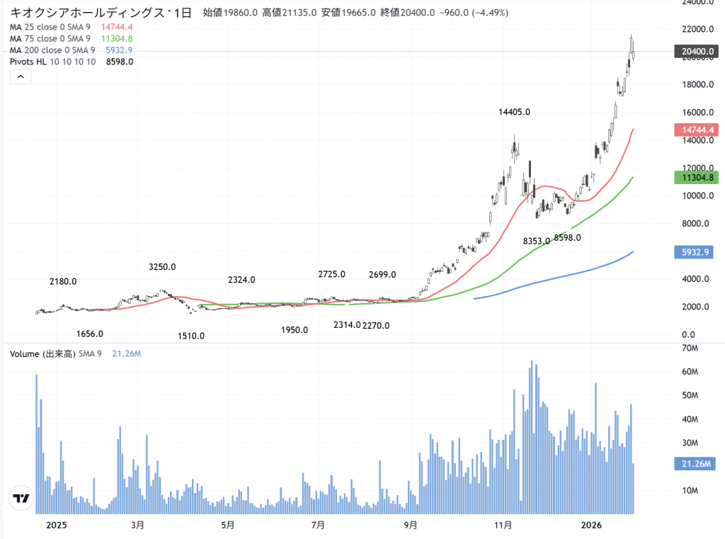 だから…「乖離」、「乖離」と、口が酸っぱくなるほど…200日線の移動平均線の話をしています。この乖離が高いなら、必ず「利食いをする人」にも時間を与えないとなりません。しかし…たまに「キオクシア」(285A) のようなケースも出てきます。先日まで1万円でも高いと思っていましたが、今は、既に2万円です。一番大きな問題は、新規上場株で売り物がないのです。「シコリ」がないのです。