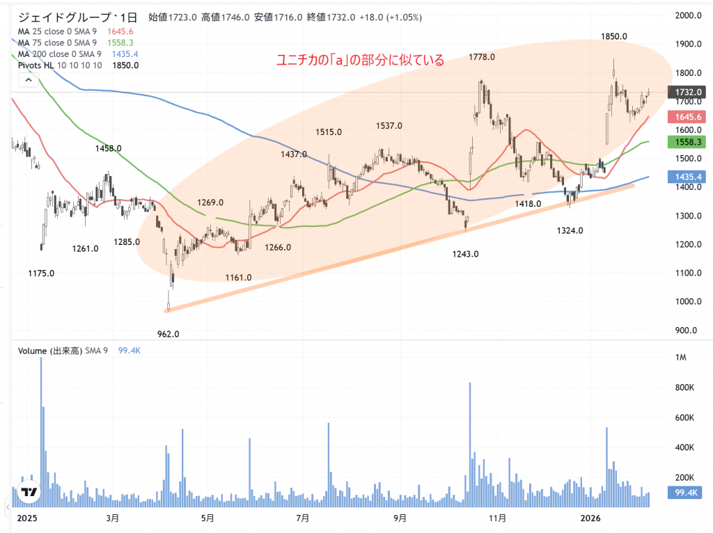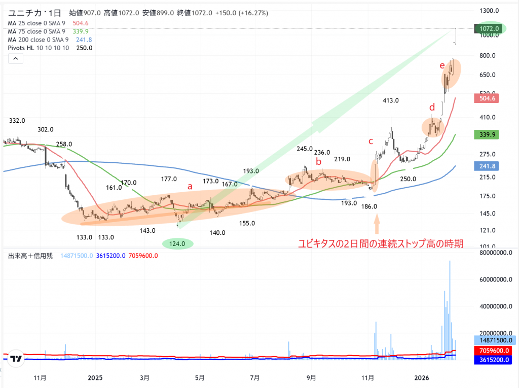 そうしてチャート上の急所はこの「e」の場面の揉み合いは下値を切り上げています。だから当然のように…今は更に株価が上がり、とうとう…124円のユニチカが1072円になったのです。実に8.6倍の躍進です。これが名目経済を象徴する相場でしょう。