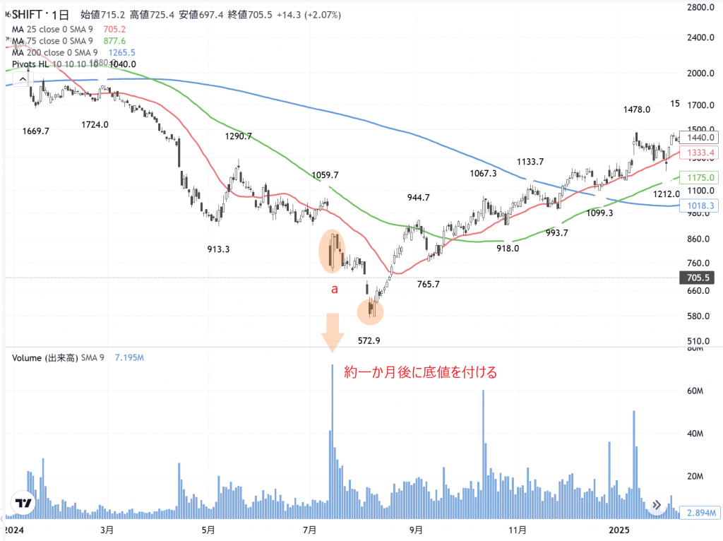 実際の2024年のケースは、実に7205万株もの「大商い」の後で、また株価は売られて…一ケ月後が「本当の安値」でした。あるいは、ここを起点にして「下値保ち合い」を演じる…可能性もあるのです。