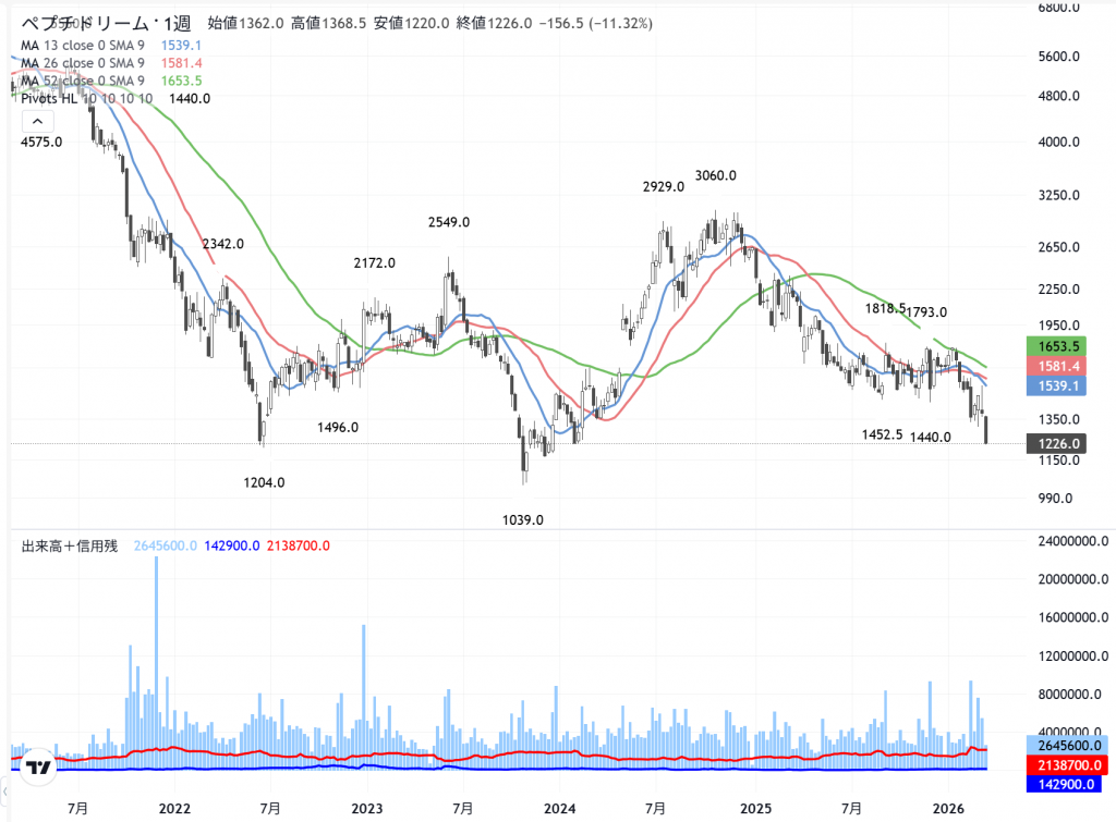 あらら…とうとう株価が崩れました。やはり今期の予測数字が読めないから、筋の良い買い物が入らないようです。お年玉銘柄のPD(4587)の話です。今までの最安値は1039円ですね。その前は1204円ですから、この辺りは買い物が入っても良さそうですが…安易に買い増しが出来ません。