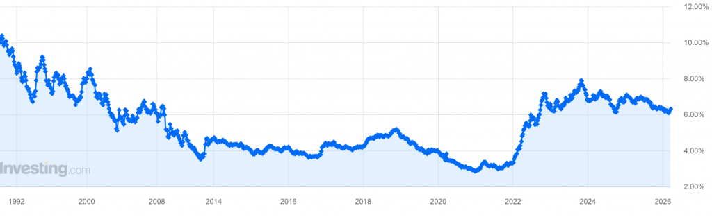 だから慎ましく暮らせば、彼女は、どうにか…生活が出来たのです。この10年間で2倍になる目安が「7%水準」なのです。この金利水準が世界標準です。名目経済の時も、大体…上限が7%です。今の米国の住宅ローン金利は少し上がって…6.3%程度に上がりました。一時は「6%割れ」になる程度だったのです。この住宅ローン金利は、基本的に住宅の「上昇価格」が勝てる程度の利回りに設定されます。