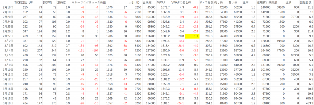 この株価データを解説しないと…みなさんは素人だから観方も分からないのでしょう。先ずは…VWAP(ブイワップ:Volume Weighted Average Price)は、その日の取引所で成立した価格を売買高(出来高)で加重平均した売買高加重平均価格です。単なる平均価格ではなく、実態に近い…その日の平均的な取得価格を表しています。