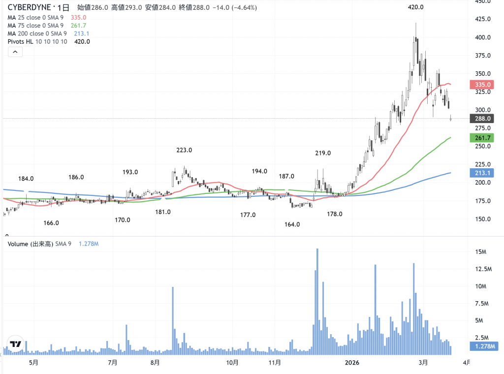 今、迷っている中でサイバーダイン(7779)が在ります。この株も予想通りなのです。この280円台は「鉄板」の筈ですが、割れるかどうか…。カタルがあの時に10万株まで増やそうとした株価です。下げるなら、少しだけ打診買いを入れてみます。たぶん…皆さんの疑念は、間違っていますよ。早晩、株価は回復して、また「元の路線」に復活すると思っています。