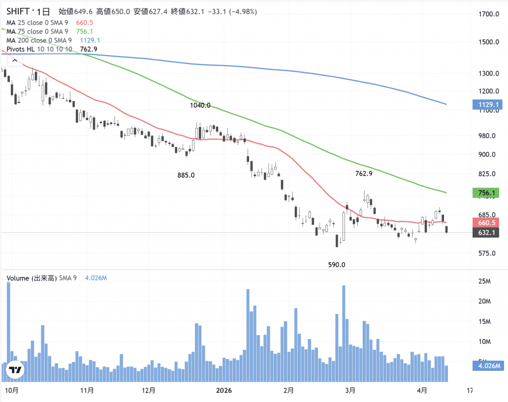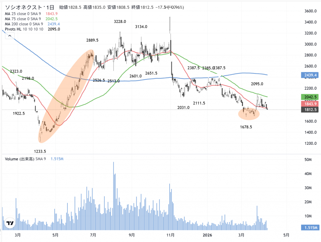 最近、観察している株でも「底入れ」を模索している段階に入った銘柄が、いくつか出ています。このSHIFT(3697)もそうですが…他にお年玉銘柄のPD(4587)も今日は安い…第一三共(4568)も更に…どの証券会社も株価が高値になった段階で推奨を続けたソシオネクスト(6526)もそうですが、どうも…底入れ段階の銘柄が多く観られます。