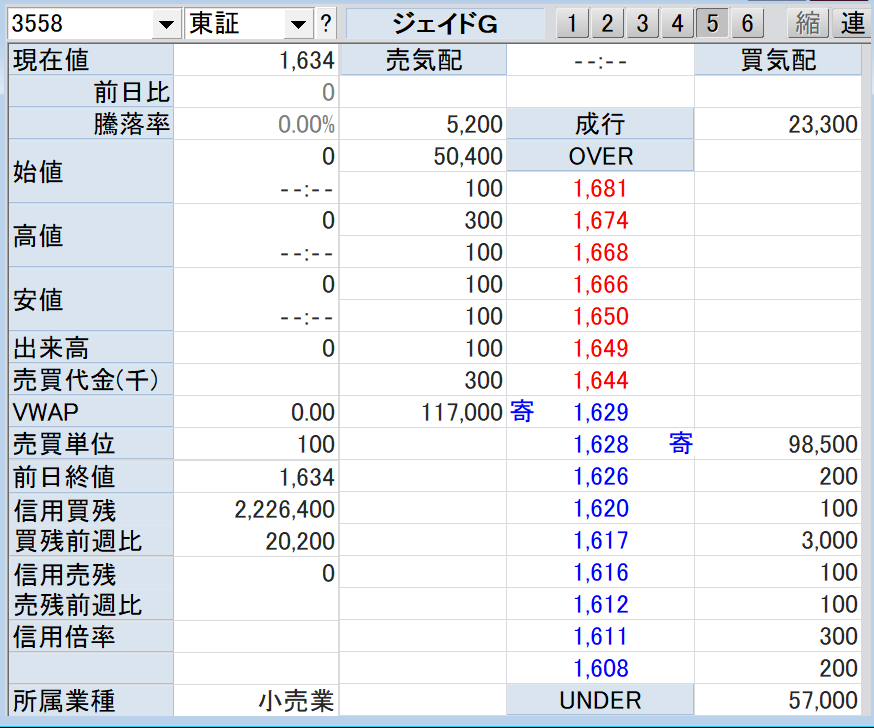 如何に…皆さんが数字を観ていないか、分かります。みんな「鞘取り」しか…考えてないから、決算を観ても信じないから、この程度の注文なのです。その後で1650円、1750円と徐々に気配値は上がりました。