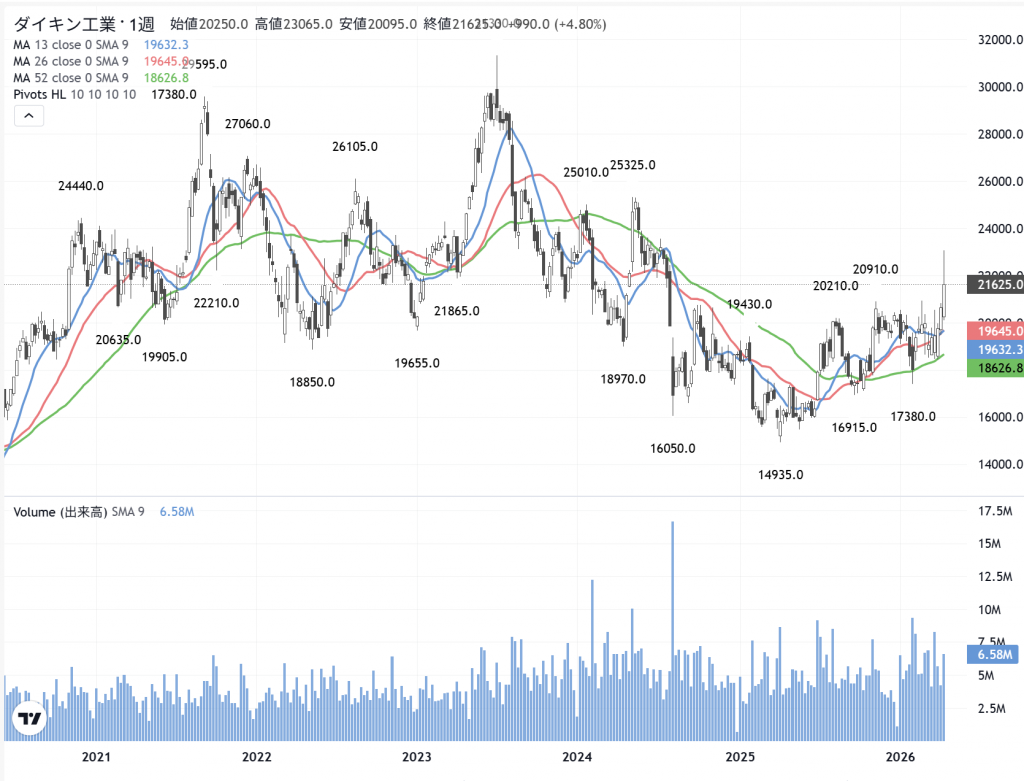 今、日本の市場には海外勢が乱入してきています。このニュースも「彼らの論理」です。ダイキン(6367)に、エリオットは「自社株買い」を要求しています。なるほどなぁ~と思いますね。この週足を観ると分かりますが、最近の株高の恩恵を、全く…受けていません。しかし時価総額は6兆3268億円ですから高い市場評価ですから、当たり前の理屈でしょう。