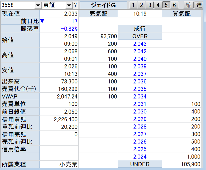 今、SHIFTを1000株だけ利食いしました。実はジェイドGが下がって来たので…2040円を500株だけ買いに行ったら、売り物がないにも拘わらず、直ぐに約定したので…2035円でもう500株を買いに行ったら、やはり…すぐに約定しました。前から出していた2030円も500株買えて…2026円まで株価が下がって来たのです。だから更に…売り物があった2030円を500株買いに行ったら…今度は200株だけの「内出来」でした。