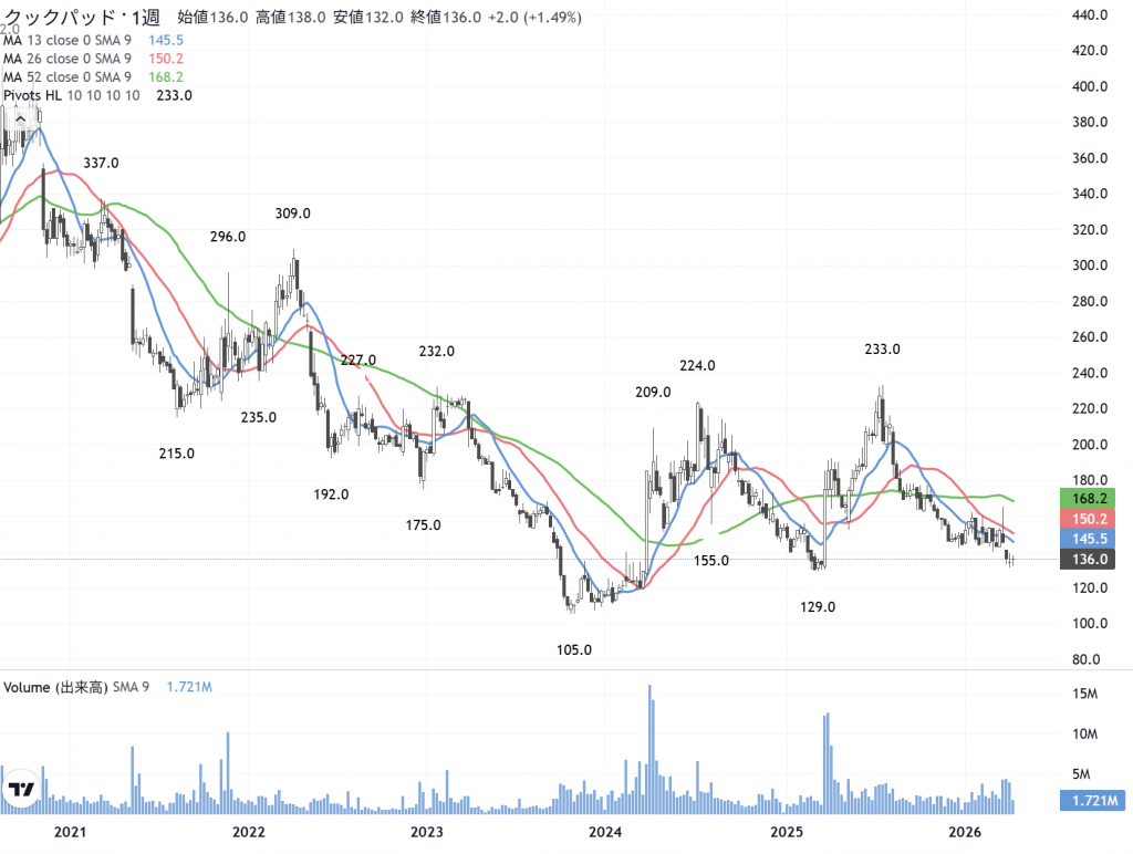 最近の新規上場株もそうですが…結構、昔と違って数字に合う株が多いのです。カタルはクックパッド(2193)や出前館(2484)の底値を這っている株に関心を持っています。