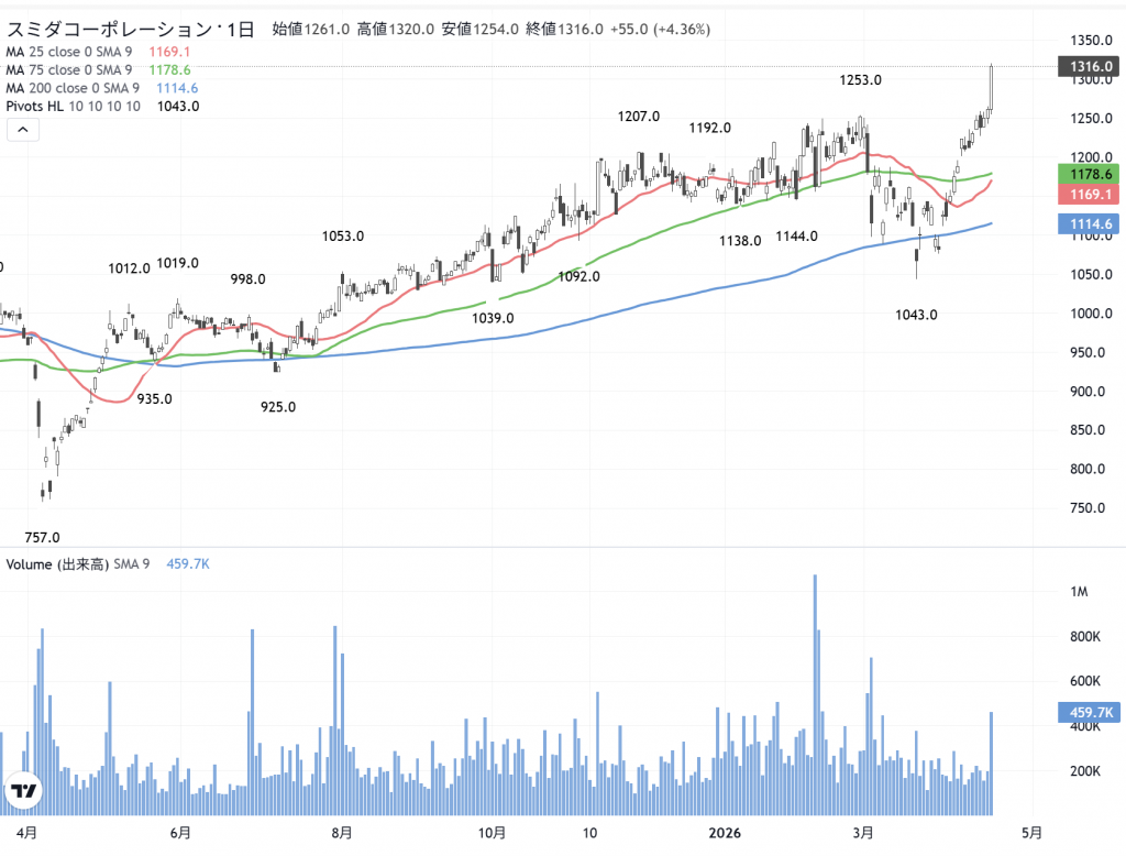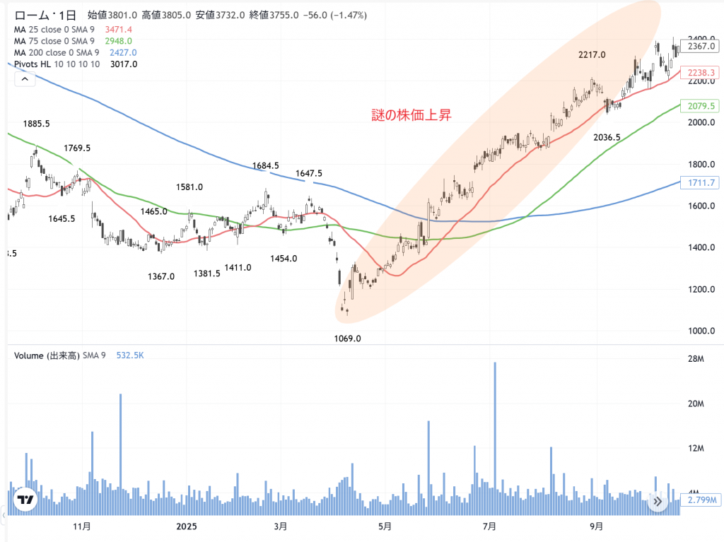 昨年4月からの反騰相場のリーダーのローム(6963)は、その形でした。だから「ロームの謎」の表現になったのです。もともと…パワー半導体は、未来の主役ですから、その狙いがあったのですが、この上げ方は凄かったのです。