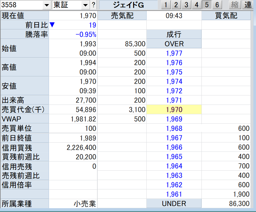 ほら…また売り物が出てきました。誰かが株を買ったら、カタルも少しだけですが追随をしようかな? 折角の売り物ですが、誰も買いません。目を離していたら…誰かが1970円の売り物を買いました。カタルも追随をしようと思ったけれど、売り物が無いようでは仕方ありません。分相応です。