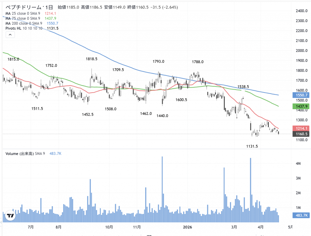 またPD(4587)が下がっています。何故かな? 買っても良いと思って、1000株だけ…買ったのですが、やはり安定しません。バランスは悪くないのですが、何か…インパクトが足りませんからね。やはり…実際の数字を観ないと、駄目なのかもしれませんね。3Dマトリックス(7777)も同じですが…次のステップに行くまで、時間を待たねばなりません。