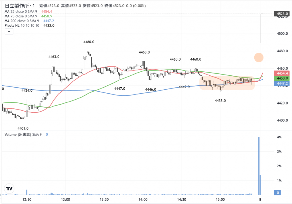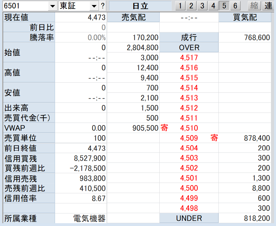 昨日の「大引け間際の値動き」を、観ていた人は分かります。「日立」(6501)ですね。それまでの値動きと違って、大引けで株価が跳ねています。そうして本日も「寄り付き」は高くなっています。その様子を観てください。昨日の値動きを含めた1分足のチャートと下には、寄り前の板状況を載せておきます。