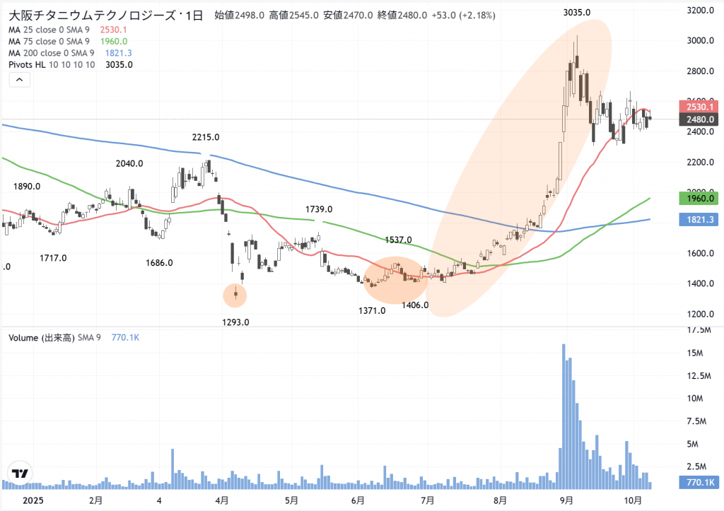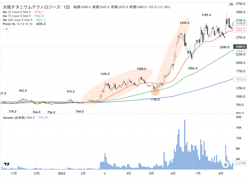 前回の「爆上がり」…つまり784円から1436円~1588円の調整過程では、2022年1月から3月、4月にかけての値動きですが、その後2022年4月から5月は「75日線」が転換点になり1140円から2949円まで株価は伸びています。最終は4850円です。