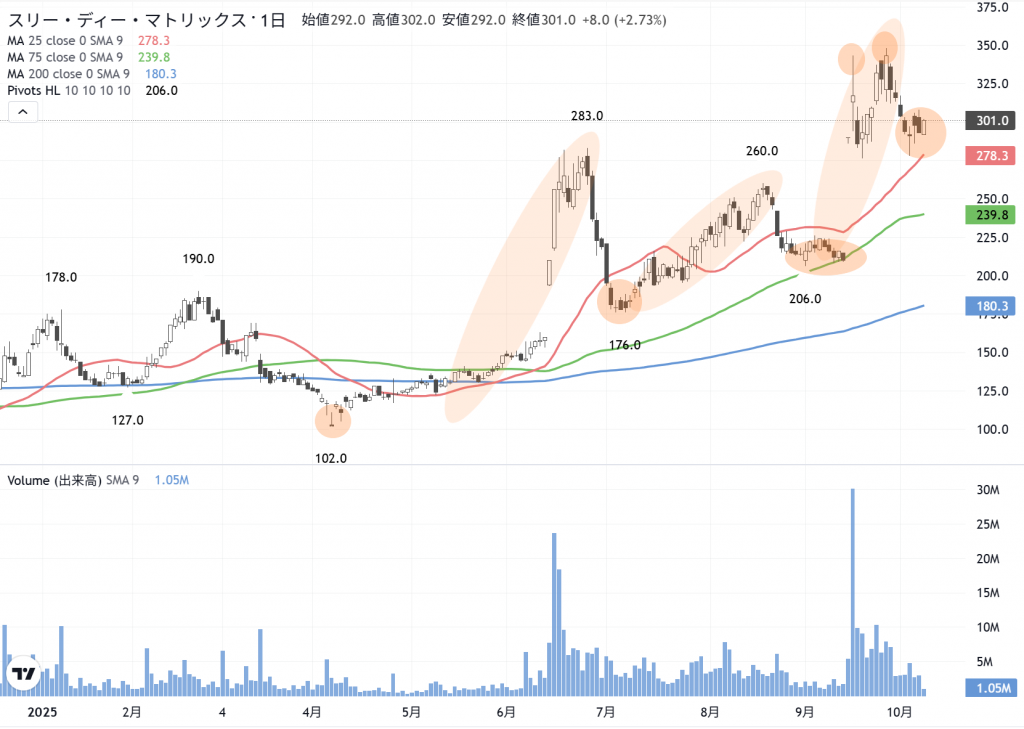 同じことですが「3Dマトリックス」(7777)もそうですネ。カタル達は2025年春の102円を付ける場面で、株を買ったはずです。だからカタル自身の「安い買値」は110円台の筈です。今回は、2回をクリアして…3回目の挑戦に入っています。